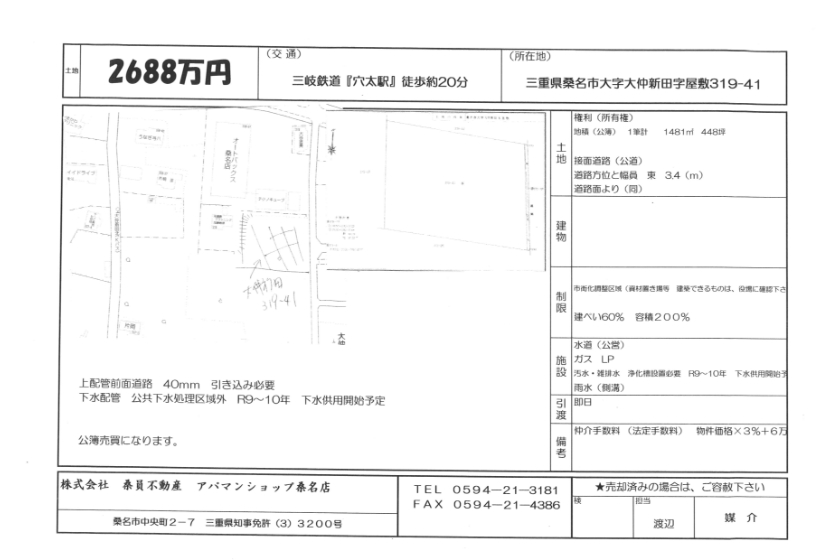 | 土地 | 権利(所有権) 地積(公簿) 1筆計 1481㎡ 448坪 接面道路(公道) 道路方位と幅員 東 3.4(m) 道路面より(同) |